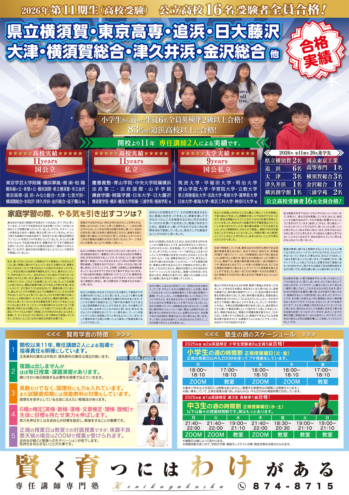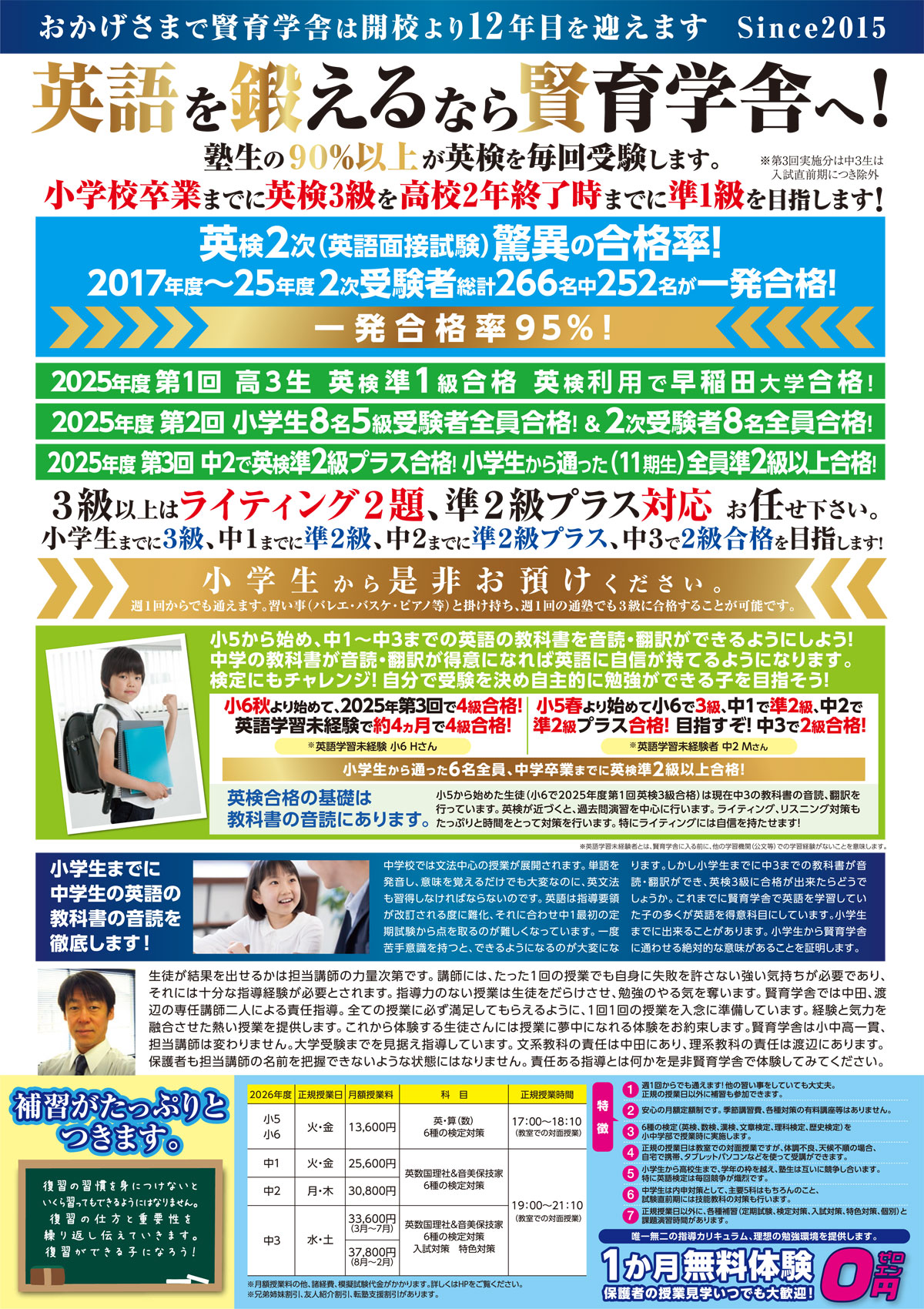 体験生募集中 賢く育つには わけがある! 全学年(小5~高3) 1か月体験(0円) 体験初日から1か月体験できます ちょっとだけ体験したい方 プチ体験もできます お気軽にお電話ください 勉強ができずに困っている子 を全力で応援します! 授業見学もできます。 是非一度、賢育学舎の授業 を体験してみてください。 競争して伸びる 実力をつける ライバルに差をつけよう! 第3回英検‹2次› 合格おめでとう! 準2級プラス 鵜川 美穂(中2) 準2級 園部 蓮太(中2) 準2級 中村 凪沙(中3) 3級 小野寺咲恵(中1) 3級 新井 美來(中2) 3級 久松 透惺(中2) 3級 守重 リカ(中2) 3級 三谷 莉煌(中2) 3級 大越 搓久(中2) 4級 相原 勘汰(小6) 4級 大竹 陽咲(小6) 4級 山崎 稜真(小6) 4級 宮川 麗美(中2) 4級 矢口悠里朱(中2) 4級 吉野 聖絆(中2) 4級 山田 陽汰(中2) 5級 田戸 芽樹(小6) 5級 脇門ひまり(中1) 5級 内藤琥太郎(中2) 5級 田戸 慈絆(中2) 5級 村松 由奈(中2) 5級 渡辺 陽(中2) 5級 末永 拓己(中2) 神奈川公立高校 合格速報 受験者16名 全員合格! おめでとう! 横須賀 2名 追 浜 6名 大 津 3名 横須賀総合 3名 津久井浜 1名 金沢総合 1名 歴史検定 合格おめでとう! 4級 古滿裕美佳(中3) 4級 大橋 邦太(中3) 4級 土屋 瑛大(中3) 4級 蛭田 滉央(中3) 4級 大松澤彩香(中3) 5級 岡田 真結(中1) 5級 沖山 彩叶(中1) 5級 木﨑 茉心(中1) 5級 三谷 莉煌(中2) 5級 園部 蓮太(中2) 5級 久松 透惺(中2) 5級 大越 瑳久(中2) 12月テスト結果 中1大矢部A 5科407点 →英94 中2大矢部A 5科415点 中3大矢部B 5科401点 →国90 中3大矢部C 5科400点 中3公 郷D 5科394点 中3大矢部E 5科393点 →英93 中3大 津F 5科392点